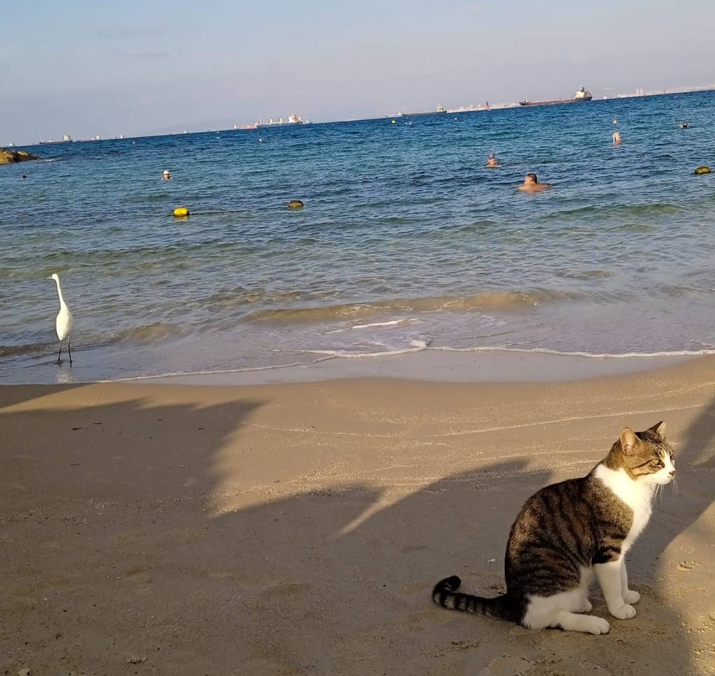 אנפת בקר לבנה טבלה רגליים במים, חתול סמור ארב לה דקות ארוכות ודרוכות מאחורי הסלעים, בעוד היא שלתה דגיגים קטנים במקורה והוא – רצה לזנק עליה. היא תפסה 2 במקור, ובלעה אחד (לבטן) בדיעבד.